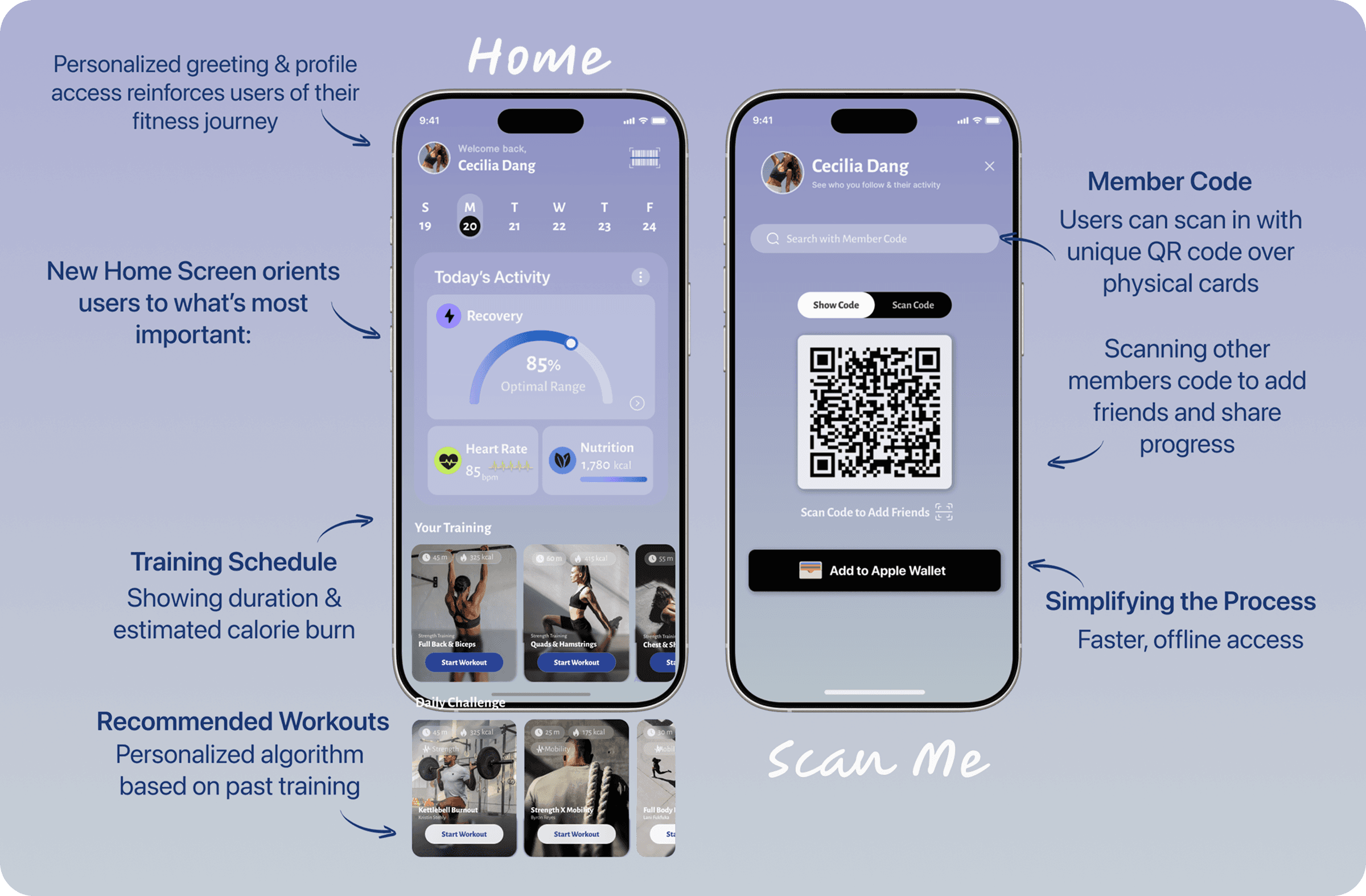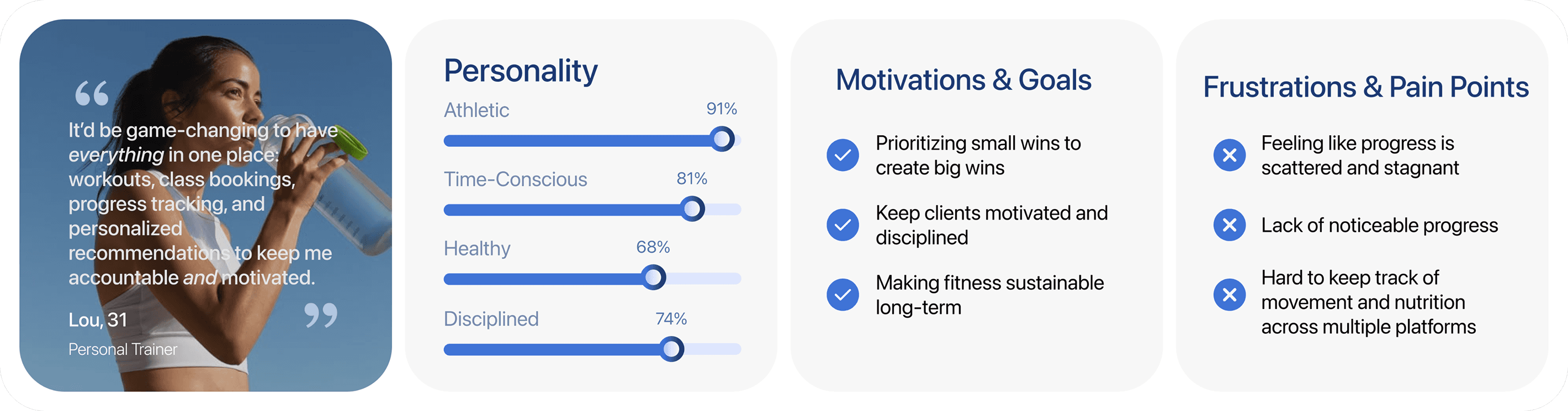 One of the most important aspects of research is understanding and personalizing user needs to enhance and streamline their fitness routines. By identifying user behavior and pain points, I could avoid common pitfalls and design a beautiful, intuitive, and immersive experience – one that motivates users to focus their energy on consistently and confidently pursuing their fitness journey.