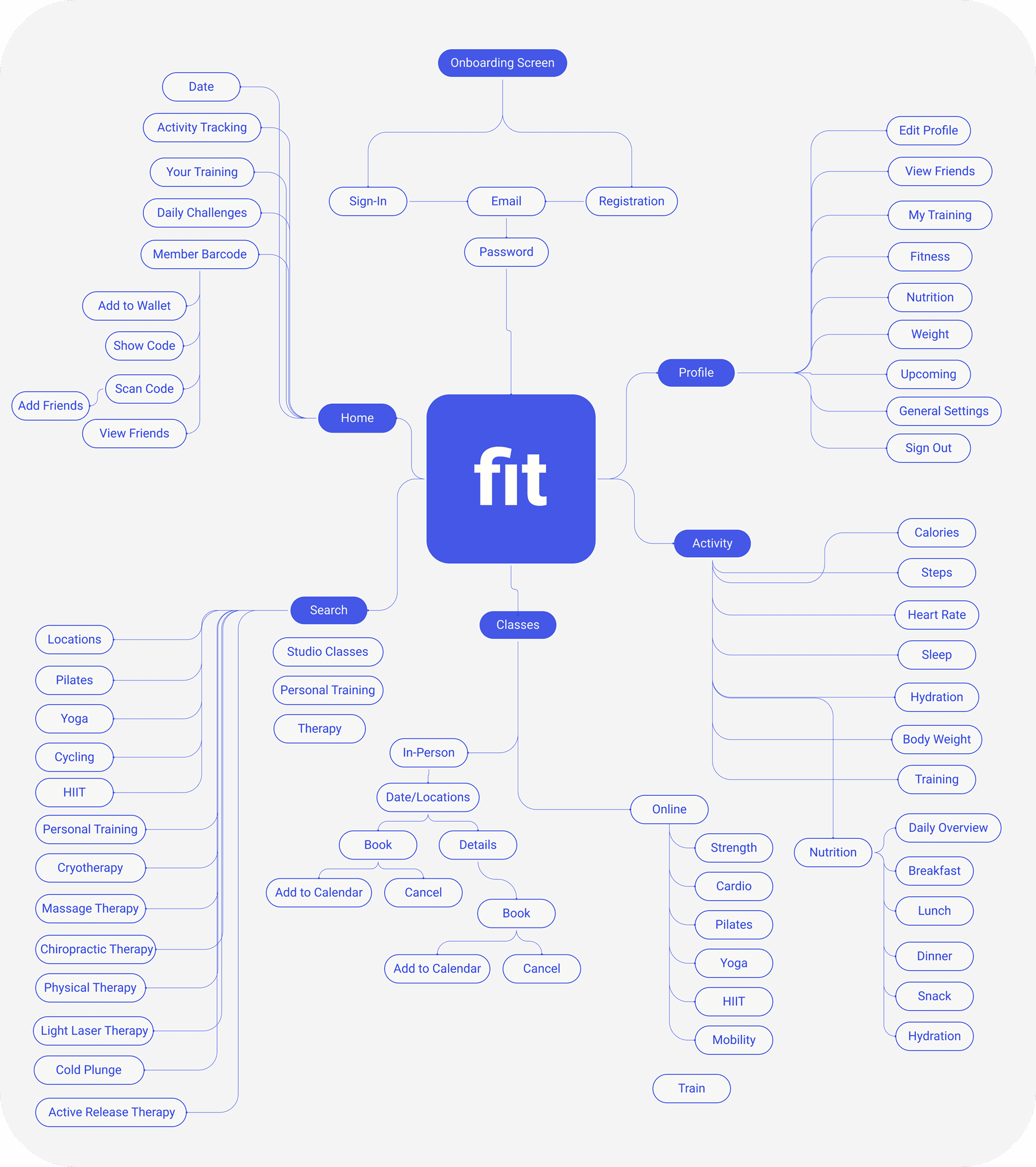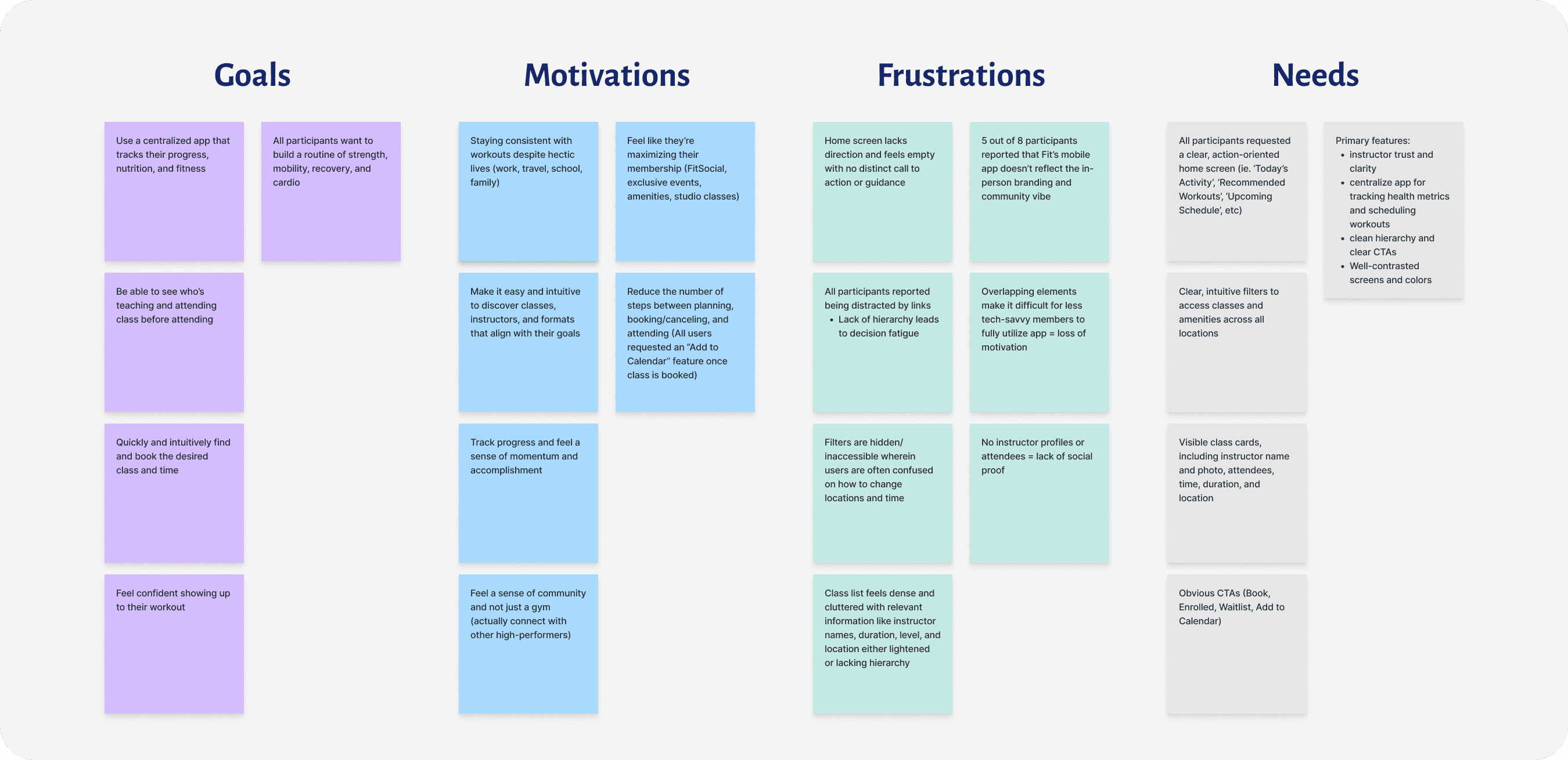 I conducted user interviews with 8 participants who attend Fit Athletic for an average of 3-5 times per week, have used similar training or fitness apps (NikeTrainingClub, Strava, MyFitnessPal, Peloton, ClassPass, Oura, Trainerize), and have explored all the features of Fit's current app. Through the interviews, I was able to discern each participant's motivations and pain points while using Fit's current mobile app versus other fitness apps as well as future desired features that would enhance their fitness journey.