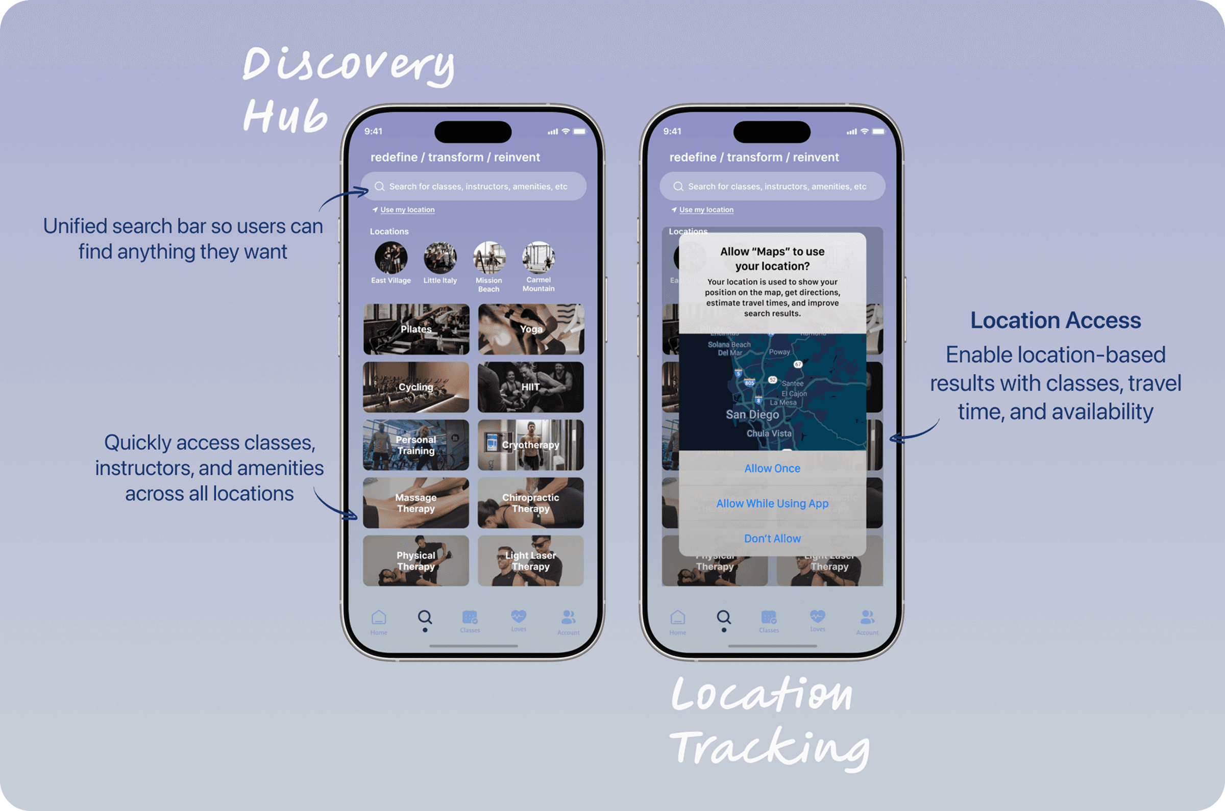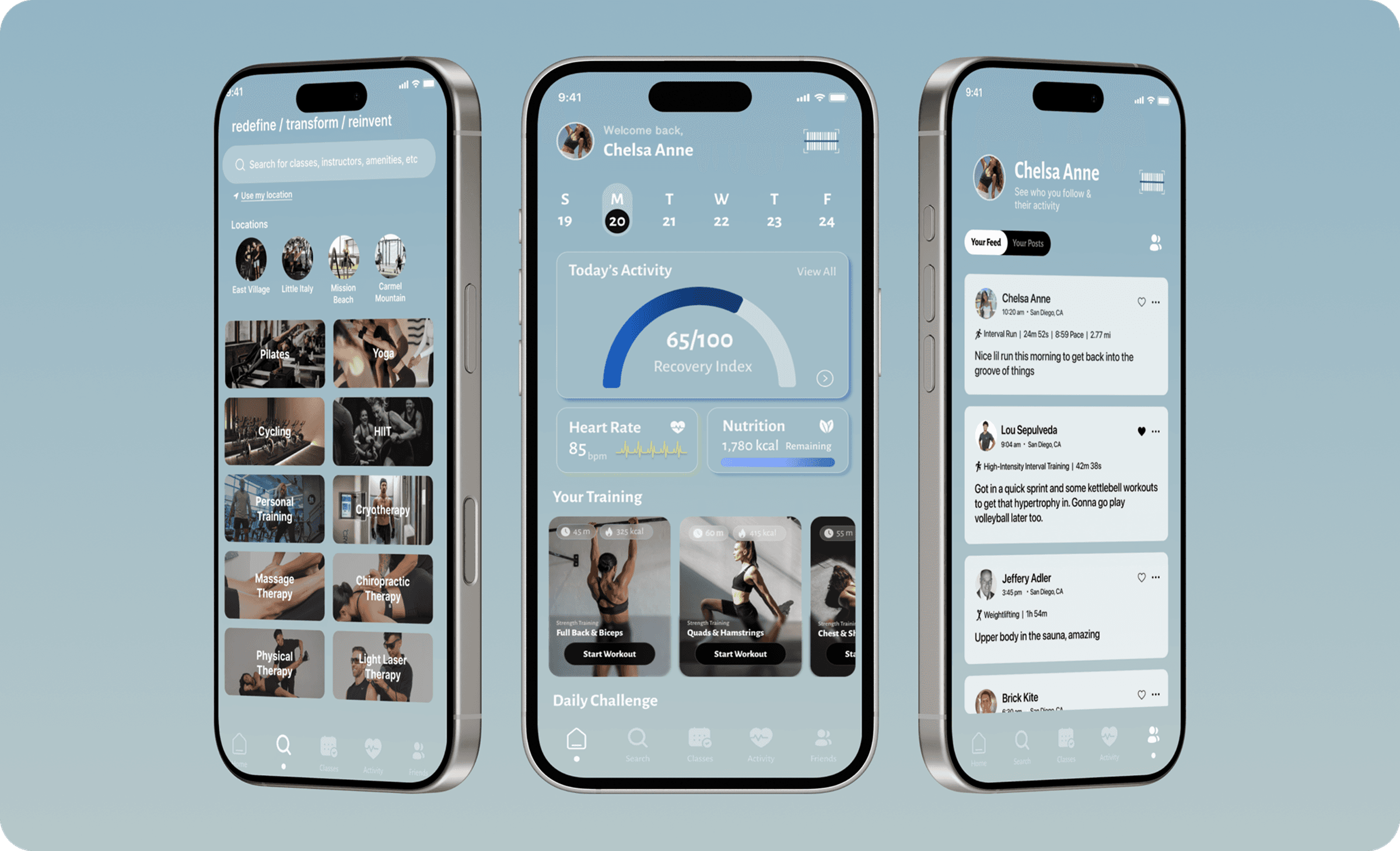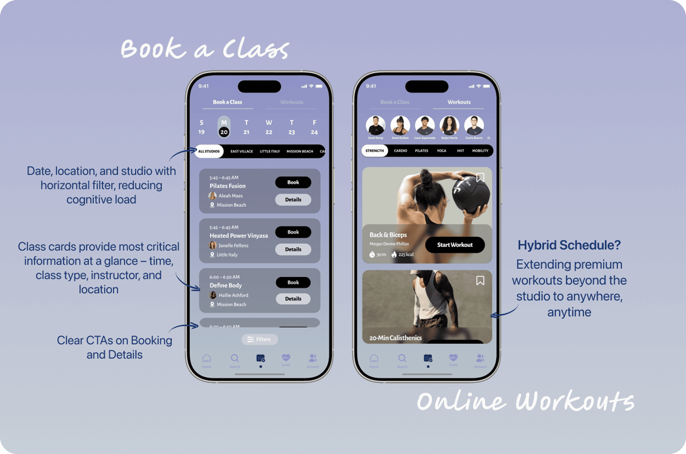 I designed a mobile experience that centralizes fitness planning, performance tracking, and community engagement into one cohesive platform. The solution introduces streamlined class discovery with immersive filters, at-home workout content, integrated health metrics, and a social feed that promotes accountability through shared progress—all designed to reduce friction and increase long-term engagement.