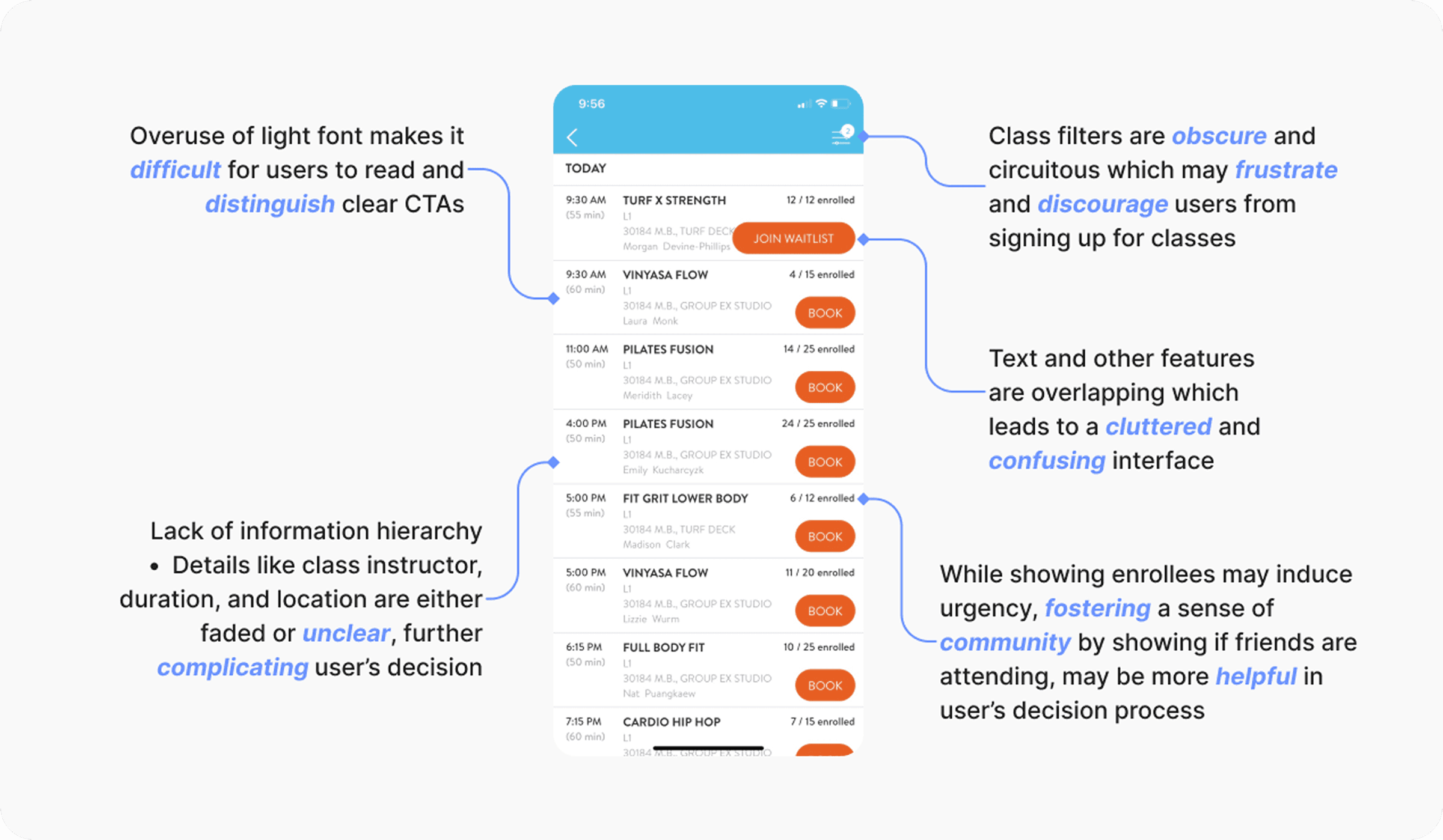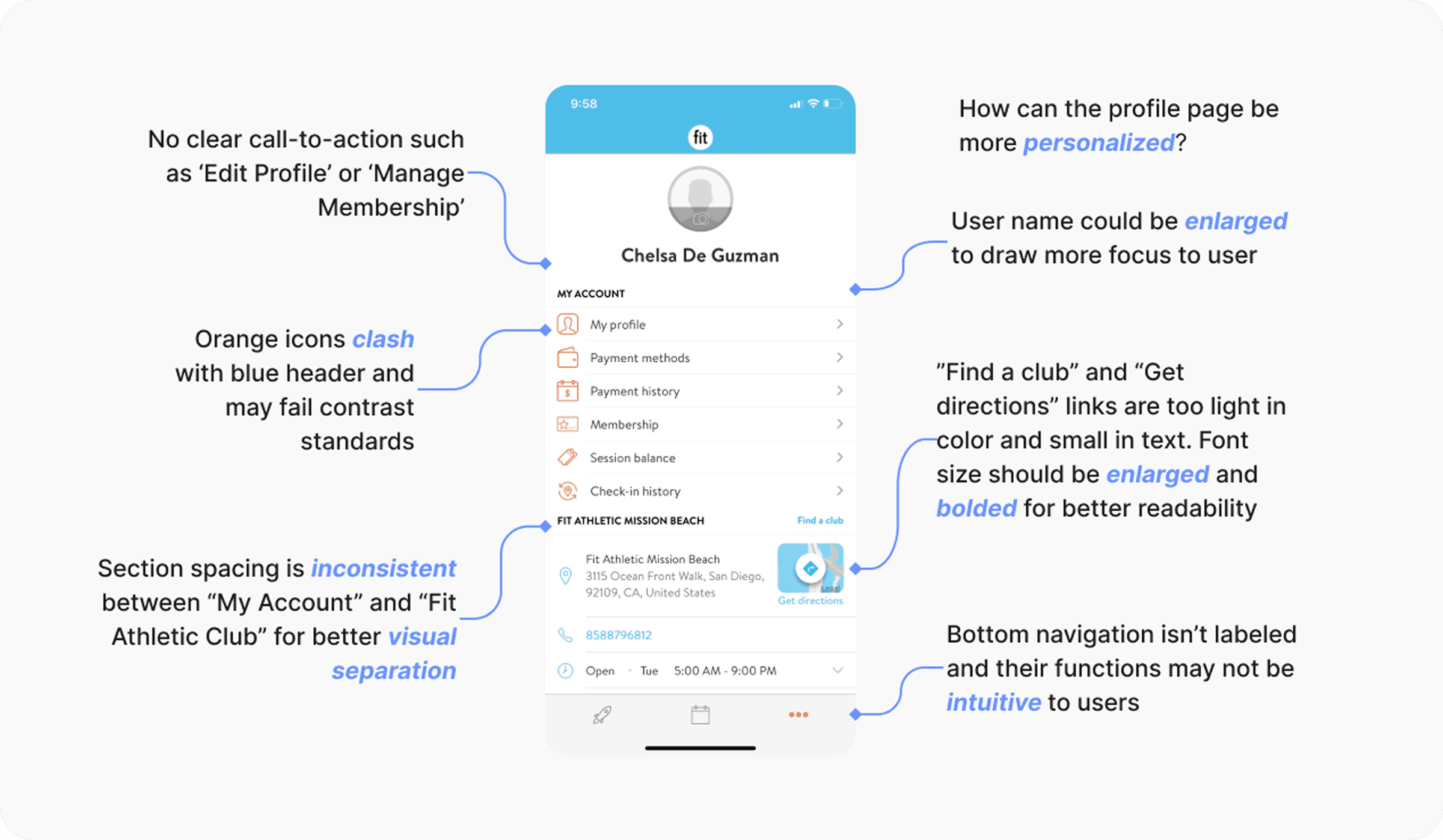 I conducted a usability testing with 8 Fit Athletic members with a focus on readability, navigation clarity, visual comfort, and task completion. The tasks included checking today's activity, booking a class, signing in via member code, adding friends, and reviewing health metrics.