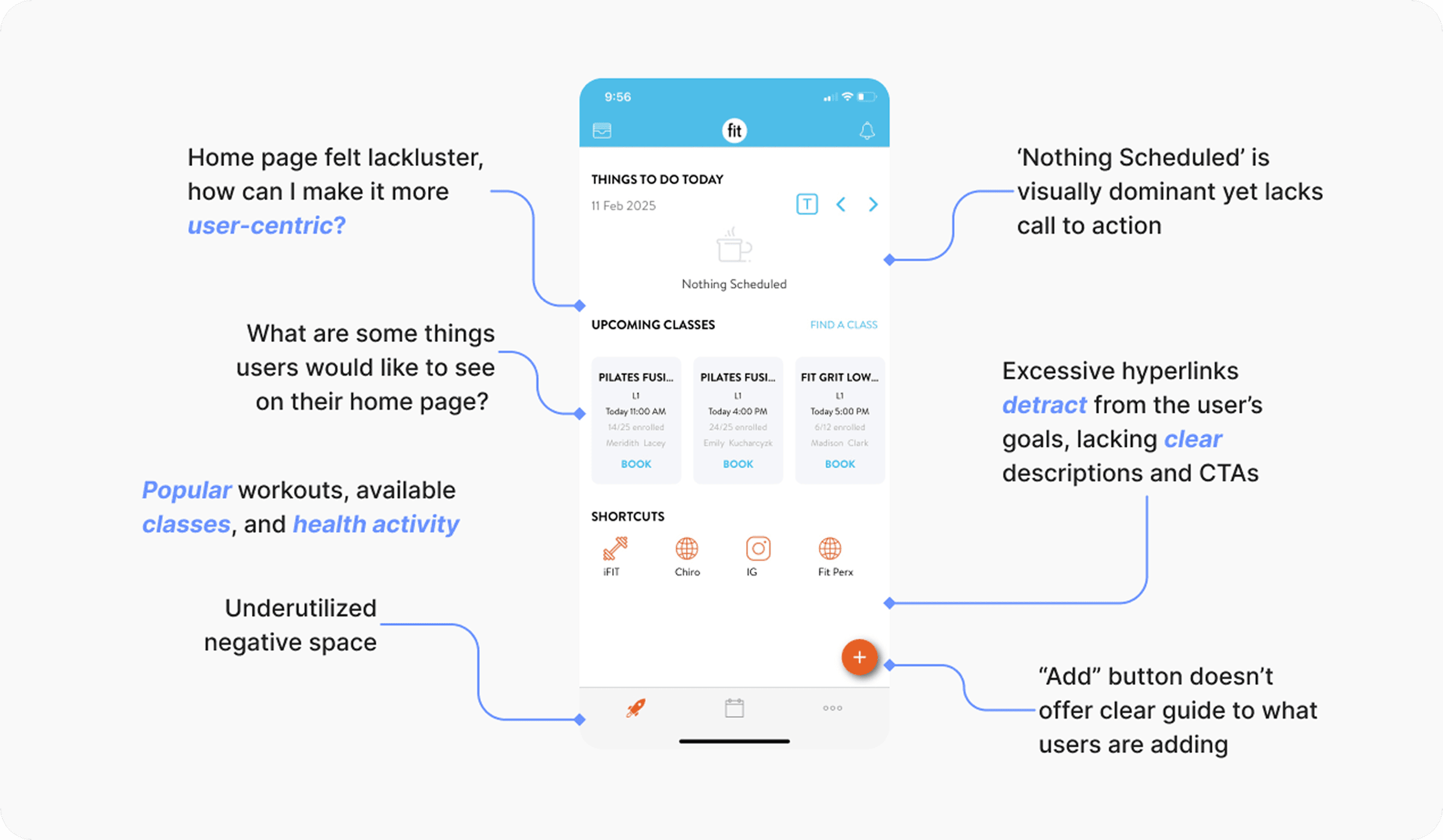 Just with a preliminary search, the App Store is flooded with a plethora of fitness and wellness apps, but only a select few – such as Nike Training Club and Peloton – consistently stand out to users, but why? To understand the differentiating factors, I started at the root: Fit's very own mobile app. Through a product audit, I identified usability gaps and underutilized features, then benchmarked those insights against the best-in-class fitness apps. The research goal was simple: prioritize the most desired features, refine existing features, and remove what doesn't serve the users – all the while maintaining a lean, end-to-end design process optimized for speed, clarity, and continuous user feedback.