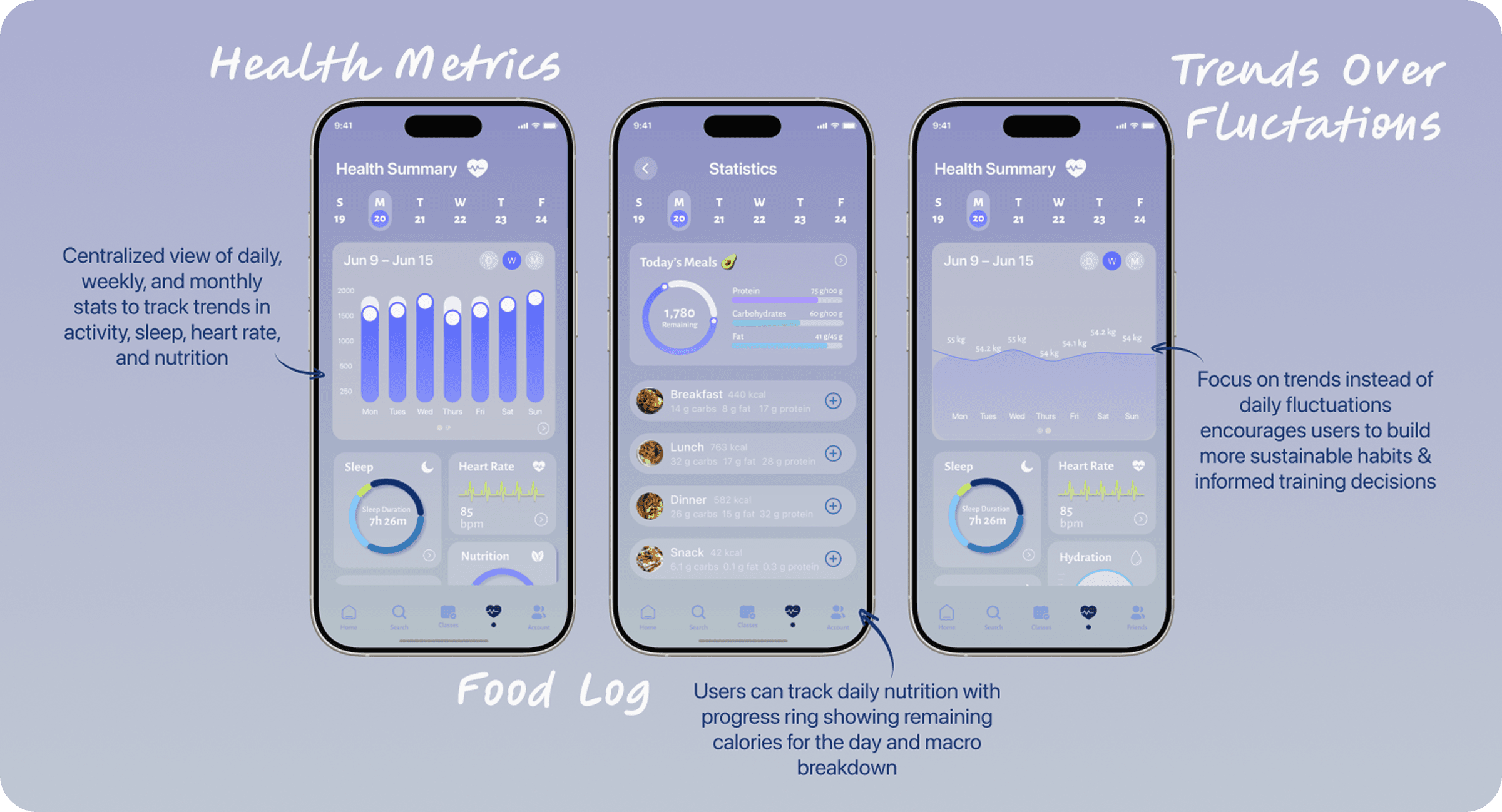 50% of particpants struggled to select any action when scanning data-heavy screens (health metrics, nutrition, and friends' posts)